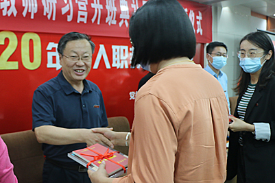 首先举行新入职教师入职宣誓仪式。校长张士强,副校长王志和各部门负责人为新入职教师代表佩戴校徽并赠送书籍。在国旗前,由自动化与电气工程学院王焱教授领誓,全体新入职教师高举右手,面向国旗,庄严宣誓。随后,新教师郭谦代表全体学员发言,表示将认真参加研习,努力成为合格的教师;王焱教授代表老教师对新入职教师表达了殷切期望和祝福。