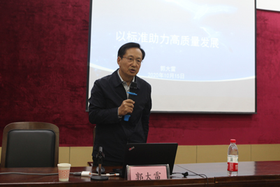 仪式结束后,山东省市场监管局二级巡视员郭大雷为大家做了《标准助力高质量发展》学术报告,重点围绕标准及标准化基础知识、标准的原则和作用、标准的经典案例、标准助力高质量发展以及加强产教融合、培养高质量标准化人才等内容,为我校标准化工程专业师生带来一场丰精彩的学术盛宴。此外,活动现场还展示了“标准保护地球”主题系列海报。