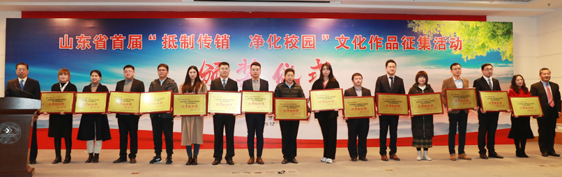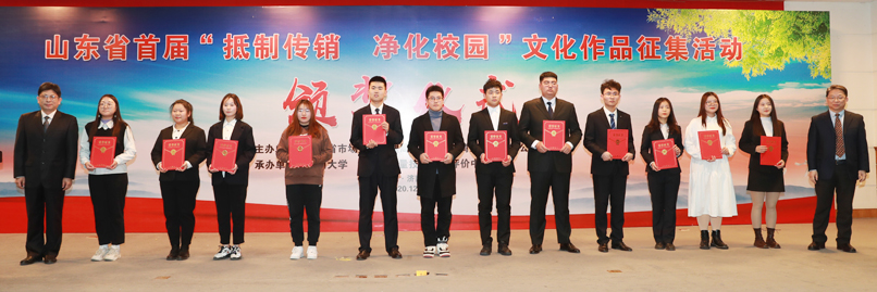 12月22日下午,山东省首届“抵制传销 净化校园”文化作品征集活动颁奖仪式在我校举办。山东省市场监督管理局一级巡视员桂敦山、山东省教育厅副厅长戴龙成、山东省公安厅经济犯罪侦查总队总队长徐磊、学校党委副书记王玉华、副校长杨景波、山东省教育厅学校安全管理处处长魏治法、山东省打击传销联席会议办公室主任李冠博、山东省公安厅经济犯罪侦查总队一级警长刘秀子、济南市市中公安分局七贤派出所副所长戴兵出席颁奖仪式。学校办公室、党委宣传部、党委学生工作部(处)、党委保卫部 安全管理处、后勤管理与基建处、团委等部门主要负责人和来自全省30所高校的主创团队、指导教师、校方代表以及新闻媒体共同参加颁奖活动。