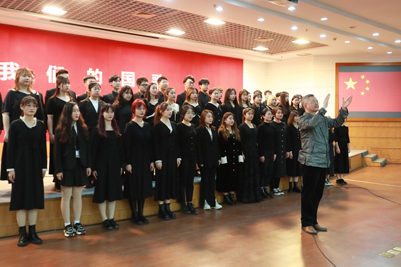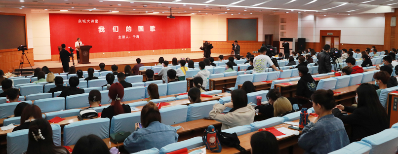 作为传颂国家最强音的国歌指挥家,于海先生对于国歌的理解深沉而透彻。他坚毅地说到:“我们的国歌有84个字,37小节,标准时长是46秒,这是每个中国人都应该牢记的。”作为推动国歌立法的国歌守护者,于海先生感慨万千。从2008年国歌法的第一次提案,到2017年的正式实施,守护国歌,已成为了他生命中的重要旋律。他动情的讲到,“《国歌》体现了中华民族的光荣传统,产生了推动中国社会前进的巨大力量,它是各族人民共同的精神支柱。”报告会结束时,在于海先生指挥,山东泉城合唱团的领唱下,现场全体师生肃立,挥舞国旗,情感饱满地唱响了激昂的《国歌》。