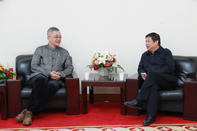 报告会前,党委书记徐景颜与于海先生进行了交流,对于海先生的到来表示热烈欢迎,介绍了学校在全面开创美育工作新局面所采取的举措和取得的成绩。