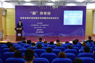 5月11日,由sunbet申搏官方网站商学院、山东省期货业协会、鲁证期货投教基地、大众网共同主办的“‘期’待有你”投资者保护进校园活动启动仪式在我校舜耕校区第一学术报告厅举行。山东证监局党委委员、副局长韩汝俊,sunbet申搏官方网站副校长刘宗明,山东证监局投资者保护工作处一级调研员胡文利,山东省期货业协会会长、鲁证期货股份有限公司总经理刘庆斌,山东省期货业协会副会长季秋红,鲁证期货投教基地负责人李丽,大众网财经部财新中心主任郭威,商学院相关负责人和部分师生参加,活动分两个阶段进行。