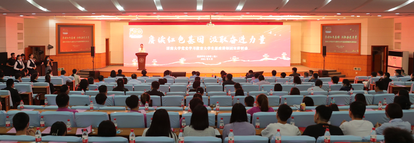 宣讲现场,徐景颜书记为大学生思政讲师团授旗,张士强校长、王玉华副书记、张硕秋副书记为大学生思政讲师团成员代表颁发聘书。讲师团以“赓续红色基因汲取奋进力量”为主题,围绕辉煌历程、伟大成就、革命传统、榜样故事四个方面,深入挖掘校史、校训、校歌、校友中的红色基因、红色元素、红色精神,把家风家训传承、个人成长经历、学科专业特点、青年责任担当与党史学习教育有机融合,坚持以“小切口”呈现“大主题”、以“小故事”展现“大背景”、以“小人物”体现“大精神”,通过新时代青年人的生活视角和讲述方式,重温波澜壮阔的百年党史,引导广大师生深刻认识红色政权来之不易、新中国来之不易、中国特色社会主义来之不易,深刻认识我们党先进的政治属性、崇高的政治理想、高尚的政治追求、纯洁的政治品质,做到不忘历史、不忘初心。