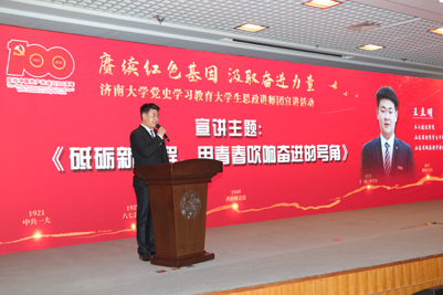 为深入贯彻落实习近平总书记在党史学习教育动员大会上的重要讲话精神,做到学史明理、学史增信、学史崇德、学史力行,5月14日下午,学校党史学习教育大学生思政讲师团首场宣讲活动在第一学术报告厅举行。省委党史学习教育第十七巡回指导组组长、临沂市人大常委会副主任、总工会主席刘淑秀,巡回指导组副组长、山东财经大学正处级组织员齐浚,巡回指导组成员马锴、初文杰、王勇、苏睿、周慧,学校党委书记徐景颜,校长张士强,党委副书记王玉华、张硕秋,党委常委、党委宣传部、马克思主义学部部长贾海宁出席活动;相关职能部门负责同志,各学院(平台)党委书记、党委副书记,辅导员和学生代表参加活动。