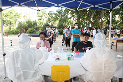 在采样现场,医护人员穿着密不透风的防护服、佩戴医用防护口罩,尽管汗水浸湿了内衣,但依然有条不紊地进行采样工作。参检人员按医院工作人员和志愿者的指引,扫描报到二维码,按流程有序进行检测采样。服务保障组穿梭于各个采样点,全力做好采样物资准备、及时进行样本传递工作。