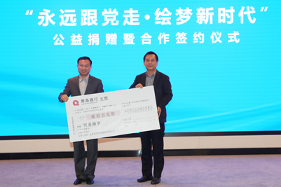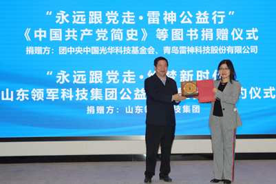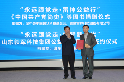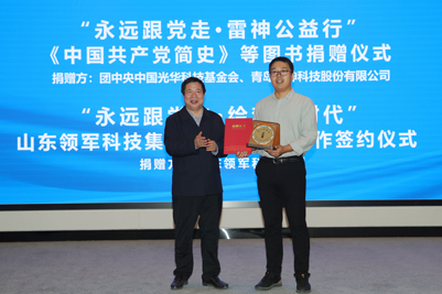 活动现场举行了“永远跟党走•雷神公益行”《中国共产党简史》等图书捐赠仪式,中国光华科技基金会图书捐赠中心主任助理边文聪、青岛雷神科技股份有限公司总经理李艳兵分别代表各自单位向sunbet申搏官方网站捐赠图书;随后举行“永远跟党走•绘梦新时代”山东领军科技集团公益捐赠暨合作签约仪式,sunbet申搏官方网站合作发展处处长卢旺、山东领军科技集团总裁李雪燕分别代表双方签署战略合作协议,李香祖董事长代表山东领军科技集团向sunbet申搏官方网站教育发展基金会捐赠200万元。sunbet申搏官方网站党委书记徐景颜为捐赠嘉宾边文聪主任、李艳兵总经理、李香祖董事长分别颁发了捐赠证书和纪念奖杯。