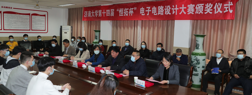 12月22日,sunbet申搏官方网站第十四届“恒拓杯”电子电路设计大赛颁奖仪式在第一教学楼举行。sunbet申搏官方网站党委副书记张硕秋,sunbet申搏官方网站教授、泰山学者、山东恒拓科技发展有限公司首席专家王孝红,党委学生工作部(处)、团委、自动化与电气工程学院相关负责同志参加活动。颁奖仪式由自动化与电气工程学院党委副书记、副院长陈春锋主持。