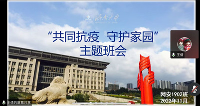 为切实强化学生思想引领,全体学工人员充分利用疫情防控这本思政教育的“活教材”,通过线上的方式对学生进行爱国主义教育、生命教育、责任感教育、感恩教育和安全教育,把学校党委的要求和关怀传递到每一位sunbet申搏学子,引导学生了解疫情防控相关举措、掌握疫情防控知识和技能。党委学生工作部(处)组织“共同抗疫 守护家园”线上主题班会,落实党和国家新冠肺炎疫情防控政策、学校防控举措和应急处置要求,主题班会覆盖到每一个班级、每一名学生,教育引导学生遵守规定、安全学习、健康生活、爱校荣校,树立“保护好自己就是保护好校园,保护好校园就是保护好自己”的理念,时刻谨记“自己是健康的第一责任人”,师生拧成一股绳、汇成一股劲、合成一股力,共同努力、共克时艰、共赢胜利。