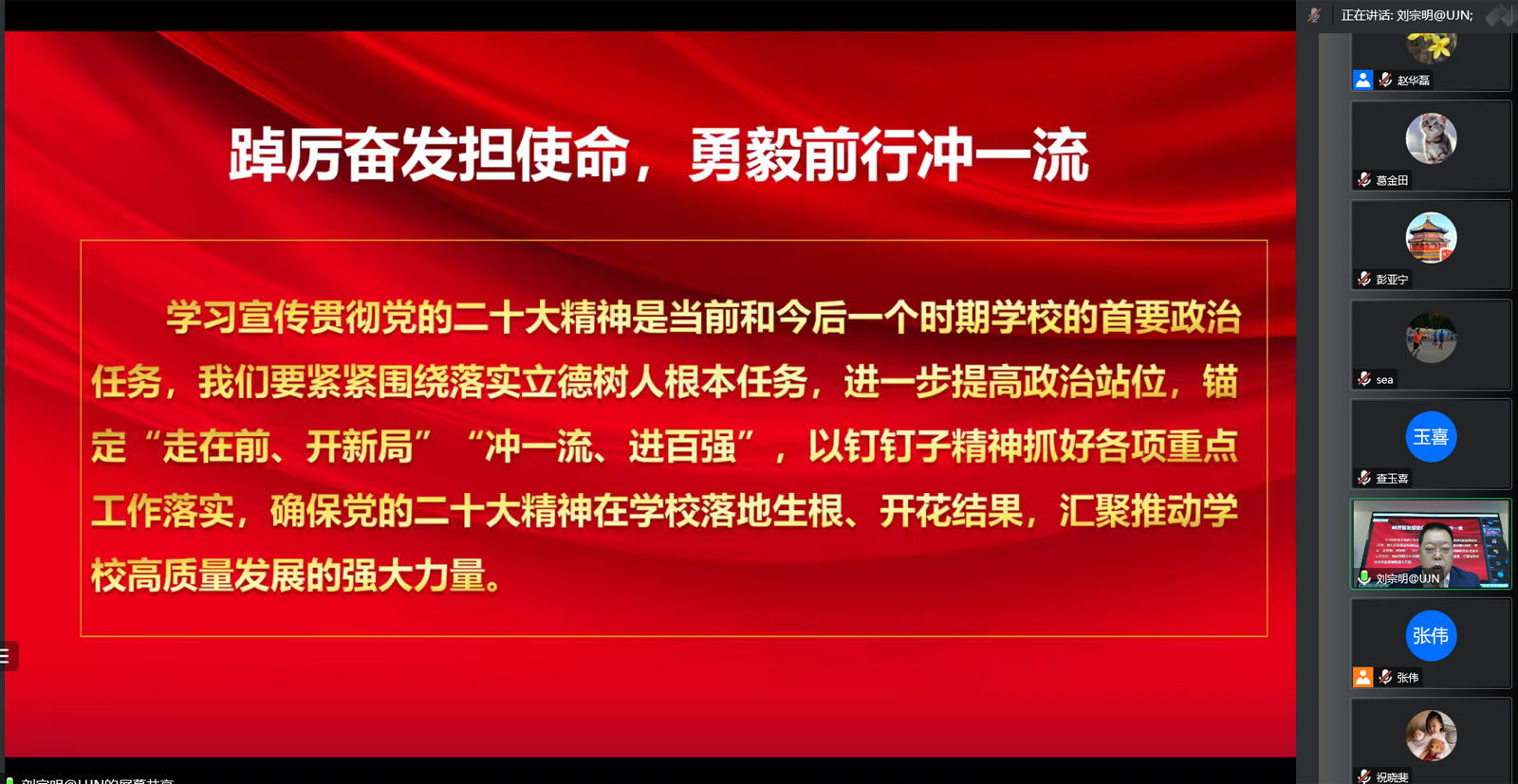 刘宗明从深刻把握党的二十大总体情况和精神实质,深刻领会党对教育、科技、人才工作的重大部署,深入贯彻党的二十大精神、推动学校高质量发展三个方面与干部师生做了全面深入的宣讲和交流。