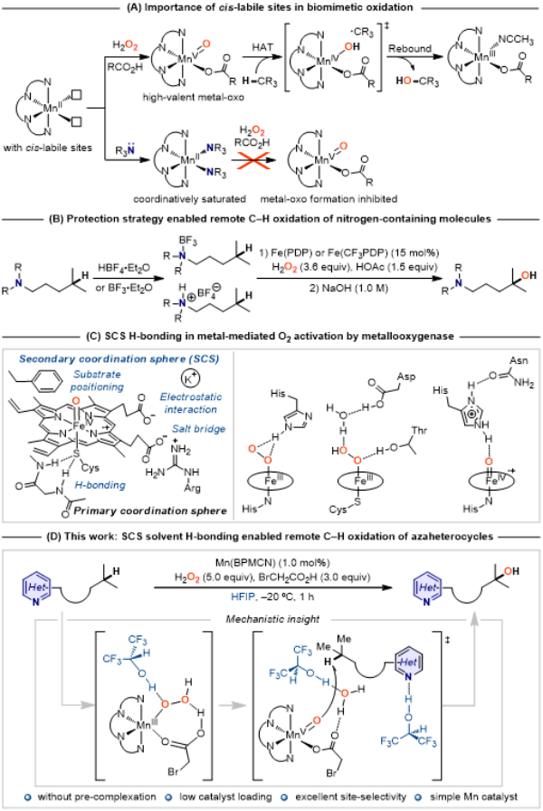 受金属加氧酶次级配位环境中的氢键启发,王斌教授课题组报道了一种次级配位环境的溶剂氢键策略,以六氟异丙醇(HFIP)作强氢键供体溶剂、廉价易得的非血红素锰配合物作催化剂,H2O2作氧源,在不需要强Lewis酸或Brønsted酸对碱性氮原子进行预先保护(图1C)的情况下实现了含氮分子中远端非活化C(sp3)‒H选择氧化(图1D)。反应机理研究表明含氮分子与HFIP之间存在强氢键,避免了催化剂因氮配位而失活,并使碱性氮原子和邻近氮原子的α-C–H去活化。此外,HFIP所产生的氢键不仅可以促进MnIII-OOH的O−O异裂生成MnV(O)(OC(O)CH2Br)作为活性中间体,还可以显著提高MnV(O)(OC(O)CH2Br)的稳定性、使得MnV(O)(OC(O)CH2Br)在C–H羟化中的活性在氢原子摘取步骤中降低,而在氧反馈步骤中提高。