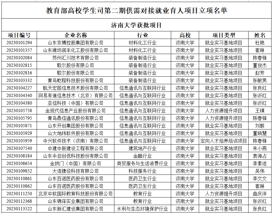 近日,教育部公布了第二期供需对接就业育人项目名单。我校有23项就业育人项目被批准立项,其中就业实习基地项目19个、人力资源提升项目3个、定向人才培养项目1个。学校在教育部第一期供需对接就业育人项目中获批立项10个,两期累计获批33个供需对接就业育人项目。