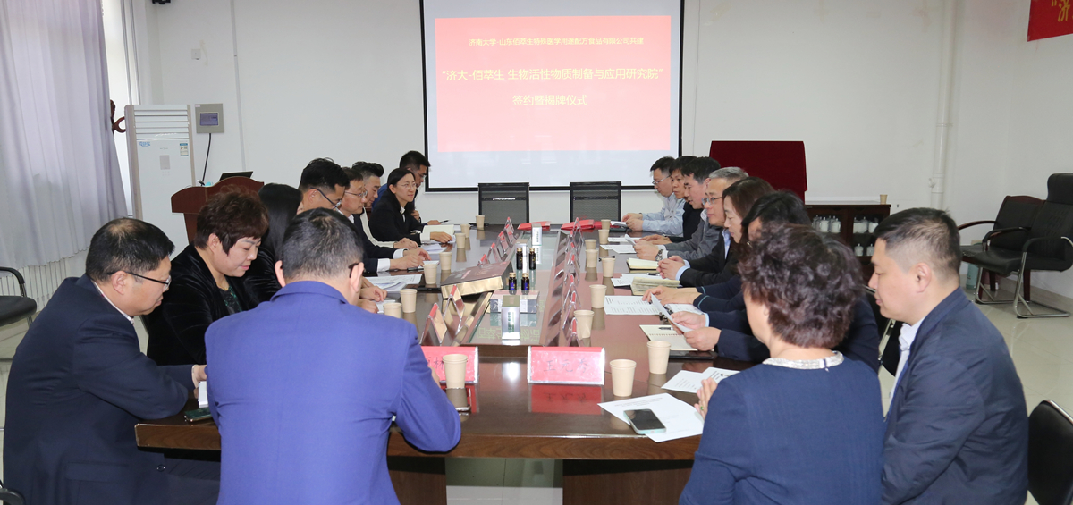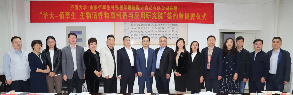 4月17日上午,sunbet申搏官方网站-山东佰萃生特殊医学用途配方食品有限公司(以下简称山东佰萃生)共建“sunbet申搏-佰萃生生物活性物质制备与应用研究院”签约暨揭牌仪式在我校举行。sunbet申搏官方网站副校长黄加栋,济南新材料产业园区管委会副主任张良通,天桥区科技局党组书记、局长耿玉远,副局长刘颖,济南新材料产业园区管委会投促局局长郑颖义,济南融通智能科技产业园总经理任平,山东佰萃生特殊医学用途配方食品有限公司董事长吕瑞军、总经理靳寓清出席活动,学校科技处、科技成果转化办公室、生物科学与技术学院相关负责同志参加共建研究院签约暨揭牌仪式。仪式由生物科学与技术学院院长何文兴主持。