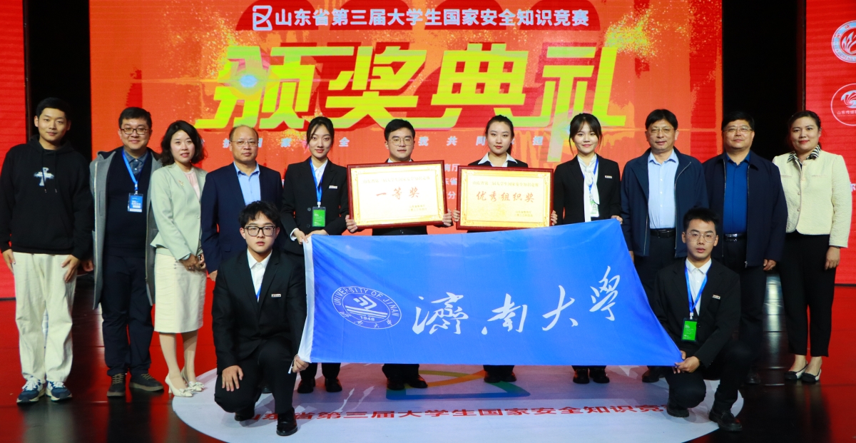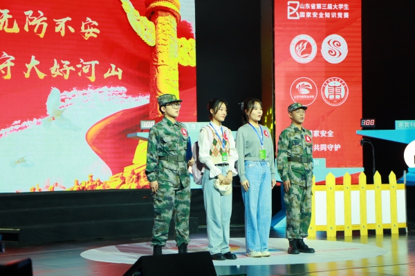 4月15日是第八个全民国家安全教育日。为深入贯彻总体国家安全观,增强学生国家安全意识和素养,提升学生维护国家安全能力和水平,山东省第三届大学生国家安全知识竞赛决赛在济南举行。我校学生代表队经过初赛、复赛和决赛的激烈角逐,凭借扎实的理论功底、过硬的素质能力和出色的现场表现,最终荣获团体一等奖,学校获优秀组织奖,政法学院黄茜被评为优秀指导教师。学校党委副书记杨景波代表学校出席颁奖典礼,党委学生工作部(处)、党委保卫部 安全管理处、政法学院等单位相关人员和学生参与此次活动。
