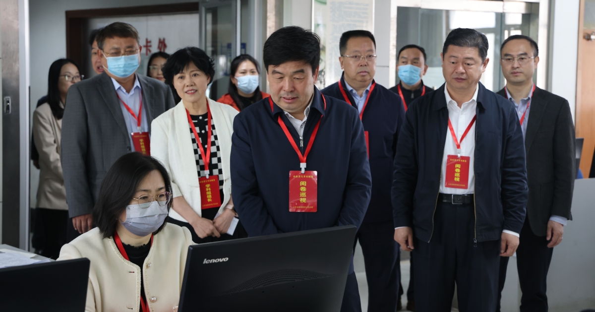 邢顺峰一行深入评卷现场,实地检查了评卷机房、技术支持、医疗保障等工作,了解评卷工作进展情况。随后,听取了学校关于评卷工作筹备组织、日程安排、人员选聘、工作进展和评卷质量保障等方面的汇报。