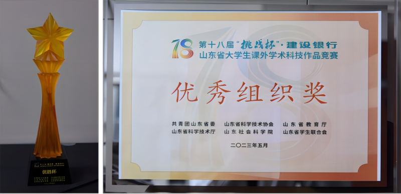 5月18日至22日,由团省委、省教育厅、省科技厅、省科协、省社科院、省学联主办的第十八届“挑战杯”·山东省大学生课外学术科技作品竞赛在齐鲁工业大学(山东省科学院)长清校区举行。我校再创佳绩,2件作品获评特等奖,6件作品获评一等奖,5件作品推荐参加国赛,总成绩位居全省高校前列。学校捧得“优胜杯”,荣获“优秀组织奖”。