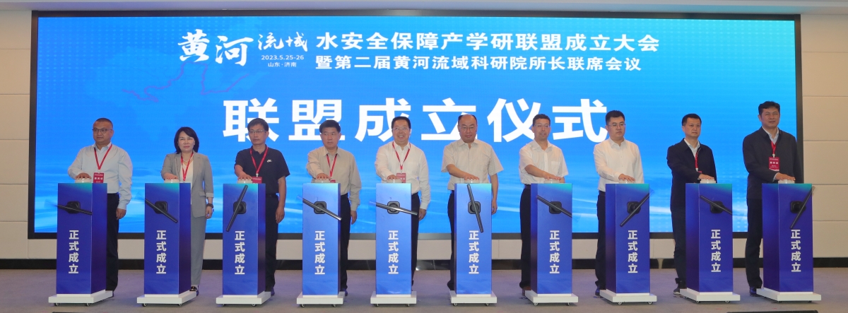 开幕式上,刘宗明、袁成金、韩霜景、段海山、范荣豪、吕家亮、李伟华、马亮、刘玉皎、陈海山等领导共同为黄河流域水安全保障产学研联盟成立揭幕。