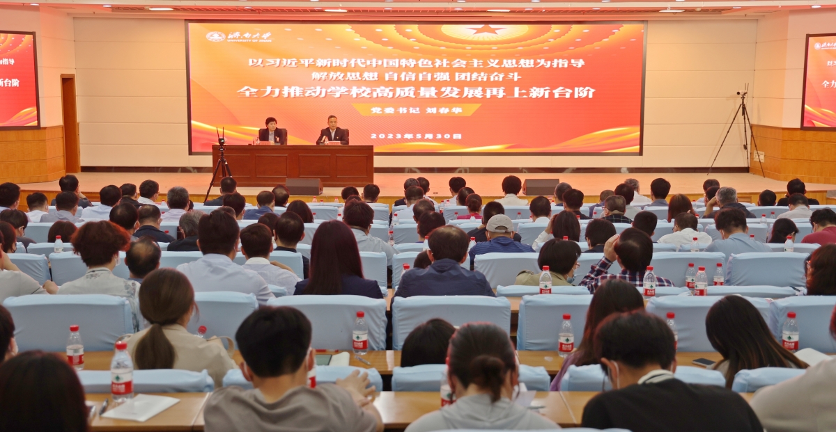 刘春华以“以习近平新时代中国特色社会主义思想为指导 解放思想 自信自强 团结奋斗 全力推动学校高质量发展再上新台阶”为题,从“在提高站位中解放思想,深刻把握习近平新时代中国特色社会主义思想的世界观和方法论”“在守正创新中自信自强,锚定‘冲一流、进百强’重点任务目标”“在团结奋斗中促进发展,坚定不移坚持和加强党的全面领导”等三个方面进行系统讲解和深入阐释。