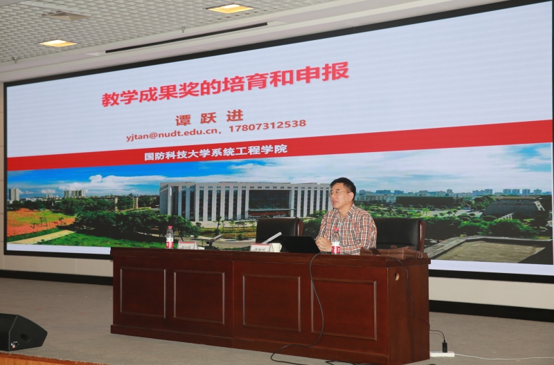 报告会上,谭跃进教授从三个方面对教学成果奖的培育和申报进行了系统深入的阐述:一是教学成果奖的形成与培育方面,详细分析了教学成果奖的形成阶段和培育过程;二是教学成果奖的申报与总结方面,科学梳理了教学成果奖的申报要求及申报书填写要点;三是教学成果奖的申报案例与体会方面,结合自己2022年度获批国家级教学成果奖的典型案例,分析阐述了教学成果奖申报书各部分撰写的方法和注意事项。谭跃进教授的报告内容详实、重点突出、针对性强,实用价值高,对我校后续高水平教育教学成果的培育工作具有很强的指导作用。