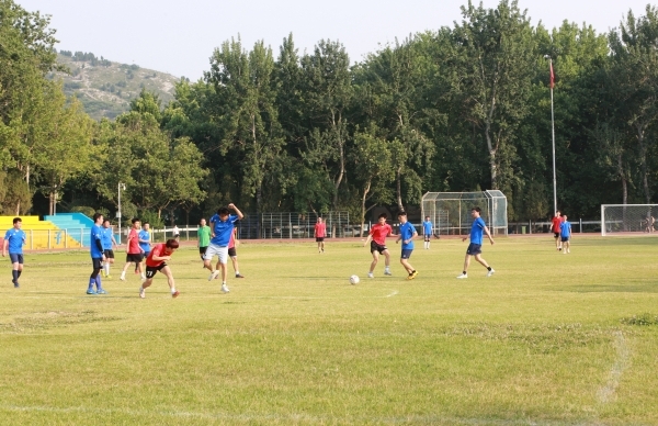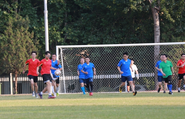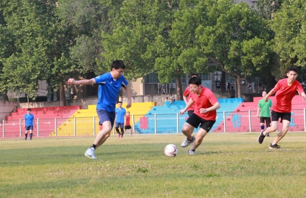 下午4时16分,师生齐聚北苑操场,在裁判的一声哨响之后,这场令人期待已久的足球赛拉开序幕。刘宗明校长为本次足球赛开球,双方队员迅速进入状态,球员们雄姿英发,纷纷开启运动模式。上半场比赛,双方队员互不相让,积极传球,默契配合,充分发挥自己的特长,足球在他们的脚下灵活飞舞。下半场比赛,他们依旧以饱满的激情,昂扬的斗志,团结向上的精神投入比赛,老师们排兵布阵,转守为攻,接连进球,赢得一片欢呼喝彩;学生们积极拼抢,稳扎稳打,相互配合做好防守,多次防守成功振奋人心。最终老师们以4:1的比分赢得了本场比赛。随后,老师和学生进行了点球友谊比赛。