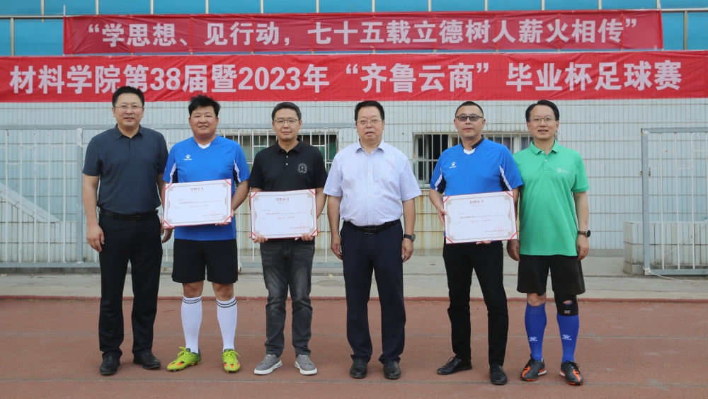 仲夏暑盛,万物并秀,骄阳般的六月迎来了一年一度的毕业季。为促进师生间交流,追忆青葱岁月,6月13日,材料科学与工程学院在北苑操场举办了第38届暨2023年“齐鲁云商”毕业杯足球赛。校长刘宗明,党委常委、宣传部部长贾海宁,优秀校友、2007届毕业生、齐鲁云商总经理魏本磊,合作发展处、学院相关负责同志,部分在材料科学与工程学院学习和工作过的老师出席并观看比赛。