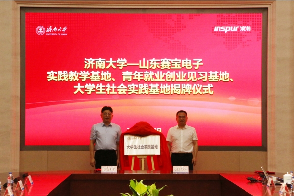数学科学学院院长孙元功与山东赛宝电子董事长、总经理蒋孝军签署战略合作协议,杨景波与张峰为基地揭牌,活动由浪潮科技党委委员、副总经理朱家兵主持。