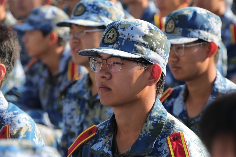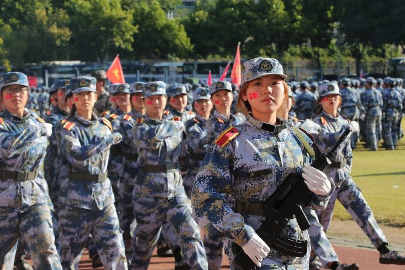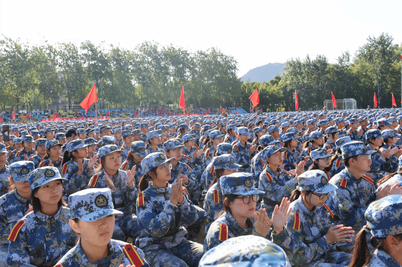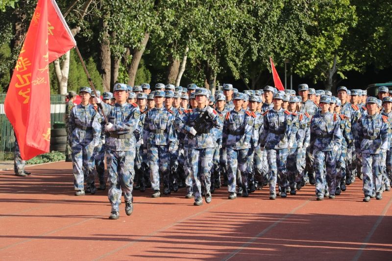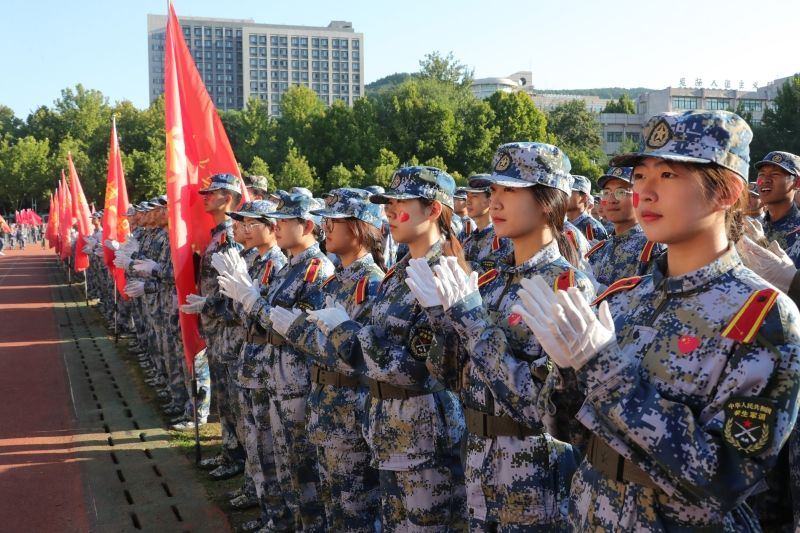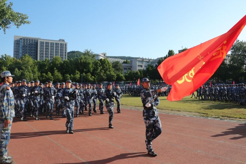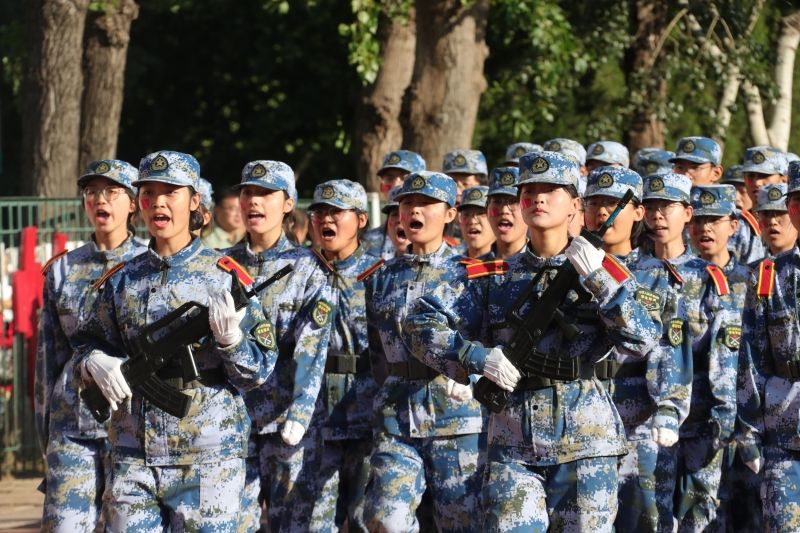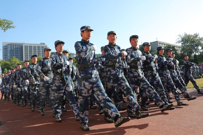 军训科目成果展示正式开始。2023级本科学生组成21个方队,他们身穿戎装、英姿飒爽,迈着整齐的步伐,喊着铿锵有力的口号,接受领导老师的检阅。