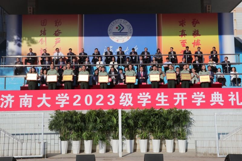 党委常委、副校长王霞宣读军训先进单位、优秀教官和训练标兵名单。物理科学与技术学院、商学院、政法学院、机械工程学院、自动化与电气工程学院、水利与环境学院、体育学院、文化和旅游学院、教育与心理科学学院、生物科学与技术学院被评为“新生军训先进单位”,董晓田等47名学生获“优秀教官”荣誉称号,张雅涵等400名学生获“训练标兵”荣誉称号。与会领导为军训获奖单位和个人颁奖。