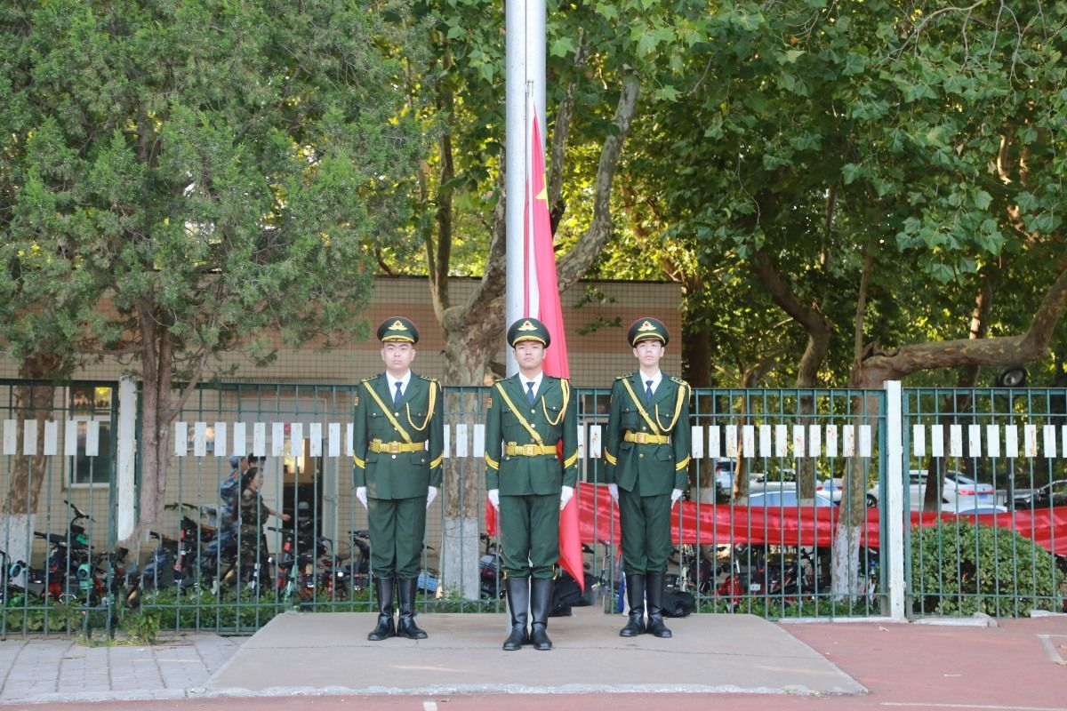 在激昂雄壮的国歌声中,鲜艳的五星红旗冉冉升起,全场师生齐唱国歌,行注目礼。