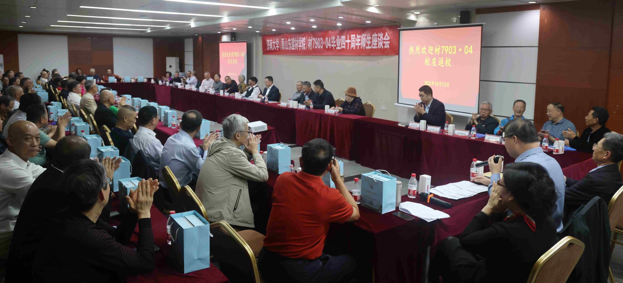 10月13日,材料科学与工程学院举行材7903·04班毕业四十周年师生座谈会暨思源亭涵廊捐建揭牌活动。部分老教师代表、材7903·04班毕业生近60人欢聚一堂,校长刘宗明出席座谈会,学校合作发展处、后勤管理处、材料科学与工程学院相关负责人陪同参加活动。