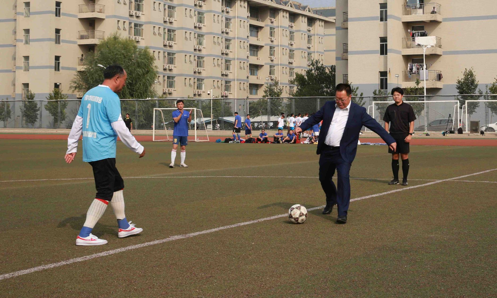 刘宗明校长为足球友谊赛开球。校友足球队向学校赠送了足球队队旗等纪念品。