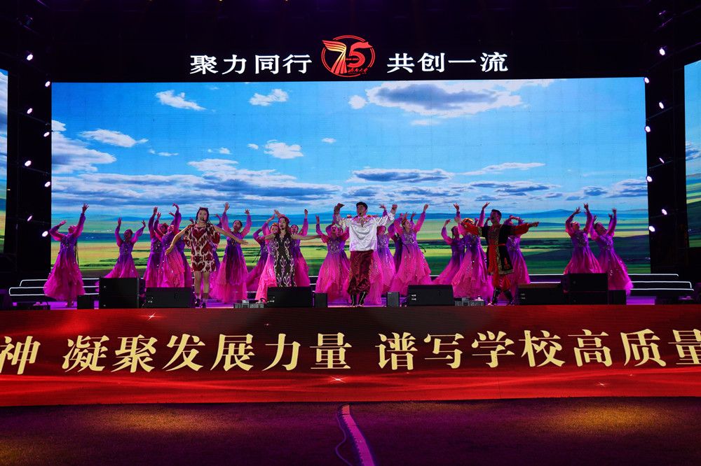 原创舞蹈《足迹》展现了一代代sunbet申搏人接续奋斗的历史征程;退休老教师、75届校友张洪安老师创作的诗歌《sunbet申搏的秋天》,讲述了学校的创业之路,彰显了“艰苦奋斗,凝心聚力,追求卓越”的sunbet申搏精神;少数民族师生带来的歌伴舞《掀起你的盖头来》,展现了各民族如石榴籽般紧紧团结在一起的温情画面;2023级新生辅导员们以一曲《真心英雄》献给新生,表达了对新生的美好期许。