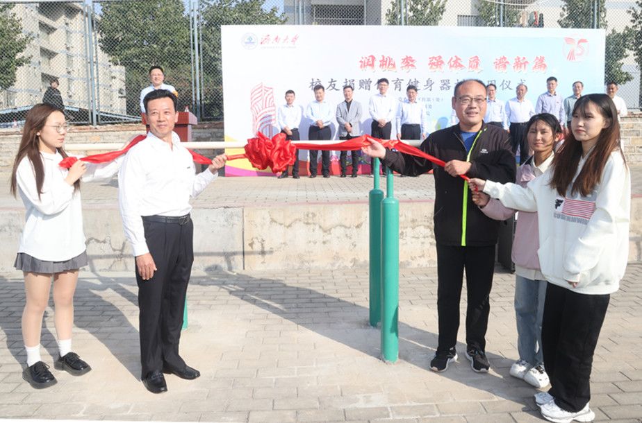 黄建军校友,学校体测办公室负责人、体育学院教师李德生,图书馆学习时长最长(累计2718.08小时)的材料科学与工程学院2020级学生张满,课上听课和课下作业完成认真的政法学院2022级学生王雨欣,才良助学金获得者、教育与心理科学学院2023级学生共同为捐赠体育健身器材揭幕。