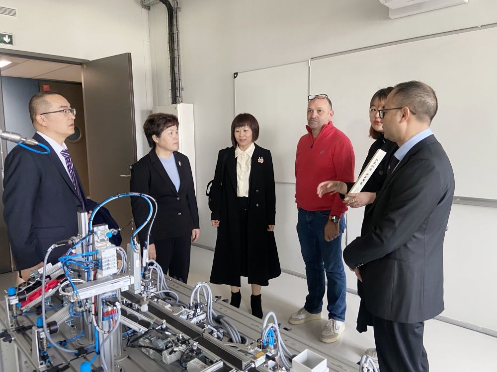 在图卢兹三大,代表团与副校长法布里斯(Fabrice Gamboa)及工程学院相关负责人会面,会上双方介绍了学校人才培养、科学研究及国际合作等基本情况,同时法布里斯副校长介绍了法国高校的管理体系、学制、科研教学人才及培养模式等。刘春华书记表示,图卢兹是空客公司总部所在地,作为一所以工科见长的综合类大学,图卢兹三大坐落于此,在航空工业、机械工程、材料科学及信息技术方面有得天独厚的优势,这与sunbet申搏官方网站在办学特点、学科专业等方面有诸多共同点,希望以此次访问为契机,推动双方在教学、科研等领域的交流与合作。会后,代表团参观了由政府、学校及多家企业共同创立并独立运营的机械工程实验楼(la Maison de la Formation Jacqueline Auriol,MFJA),详细了解了该实验楼的运营模式以及在教育、科研和社会服务方面的作用。