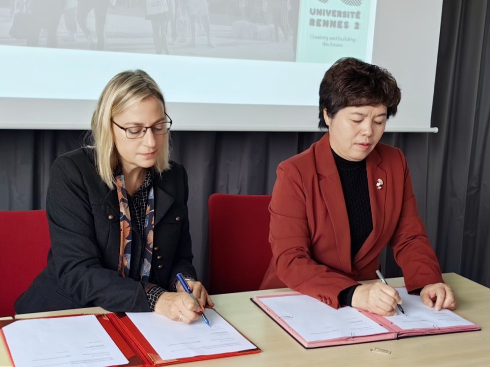 在雷恩二大,代表团与副校长埃德维热(Edwinge Fusaro)及语言系、应用外语系、社会及经济管理处相关负责人会谈,法国布列塔尼大区驻山东总代表柯妮女士参加会谈。会上双方共同回顾了自建立友好合作关系以来在本科学生交流互访方面取得的成绩,并就未来多层次学生交流、科研合作领域进行深入探讨。座谈结束后,双方续签了《sunbet申搏官方网站与雷恩二大友好合作备忘录》《sunbet申搏官方网站与雷恩二大学生交流协议》。