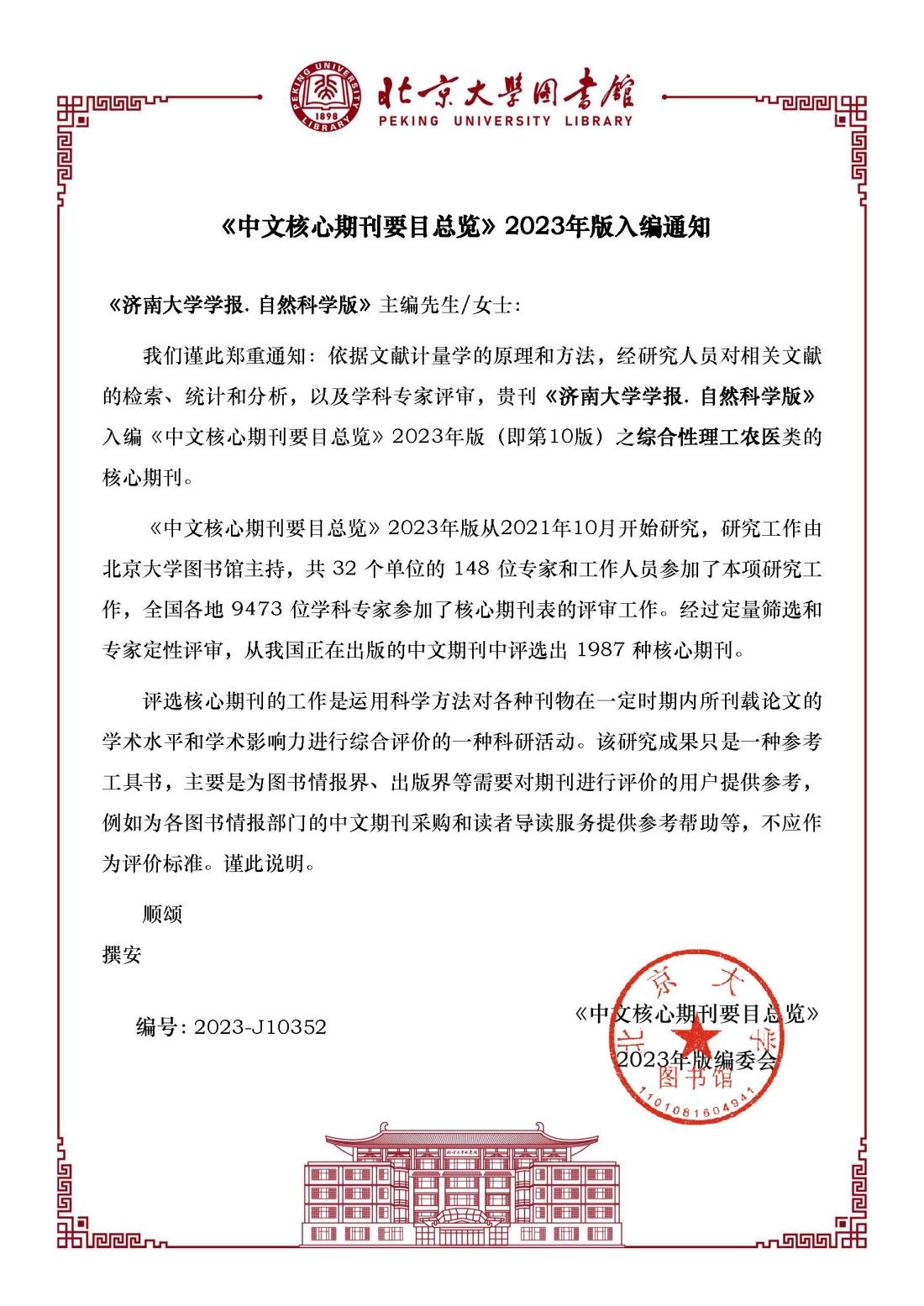 经过定量筛选和专家定性评审,《中文核心期刊要目总览》2023年版(即第10版)共从我国正在出版的中文期刊中评选出1987种核心期刊。这是该刊继2008年版(即第5版)首次入选后,连续6次入选中文核心期刊要目。