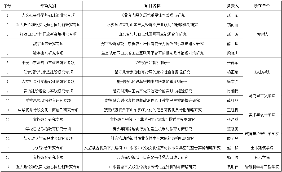 近日,2023年度山东省社科规划研究专项评审结果正式公布,我校申报的17项课题获得立项,立项数量排名省属高校第2位。