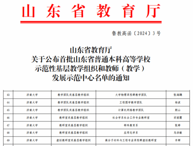 近日,山东省教育厅发布了《关于公布首批山东省普通本科高等学校示范性基层教学组织和教师(教学)发展示范中心名单的通知》,我校申报的7个基层教学组织全部获评山东省示范性基层教学组织,涵盖教学团队类、教研室类、虚拟教研室类等不同类型。