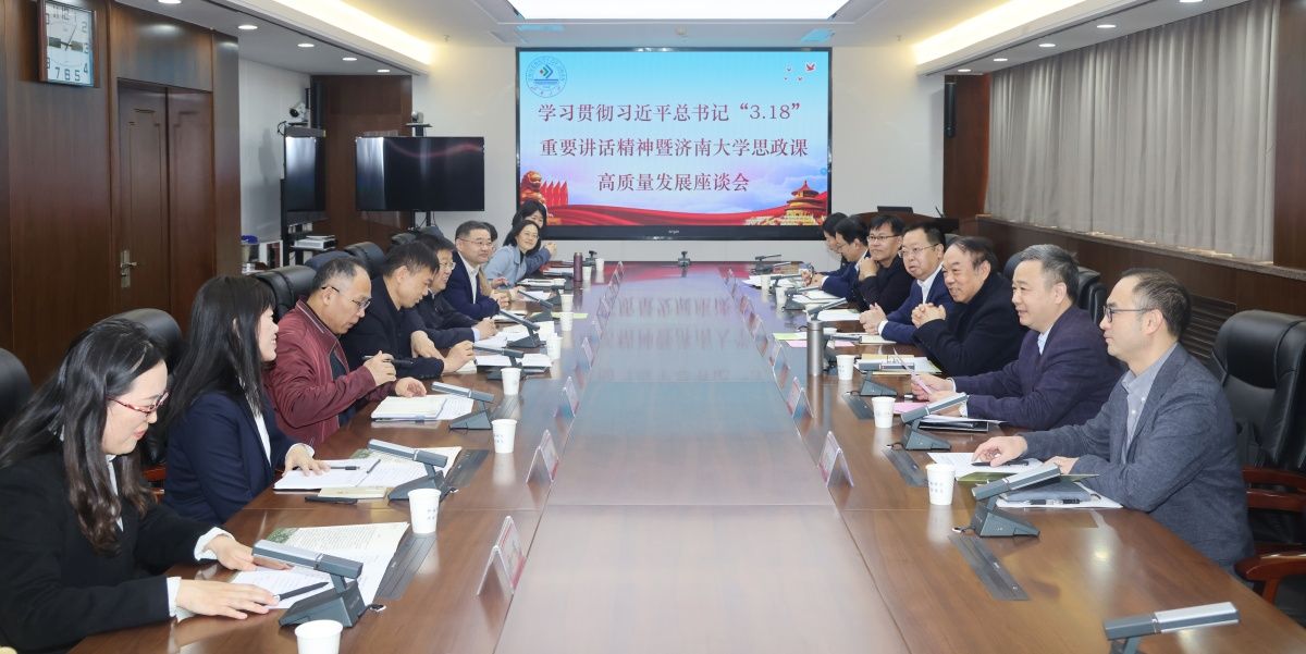 在习近平总书记“3.18”重要讲话五周年之际,3月13日上午,学校召开学习贯彻习近平总书记“3.18”重要讲话精神暨sunbet申搏官方网站思政课高质量发展座谈会。山东大学世界政党研究中心主任王韶兴、济南市教育局思想政治教育处处长王翔宇受邀参加座谈会,校长刘宗明出席座谈会并讲话。学校党委副书记查玉喜主持座谈会,党委宣传部、教务处、社科处、马克思主义学院负责同志和师生代表参加座谈会。