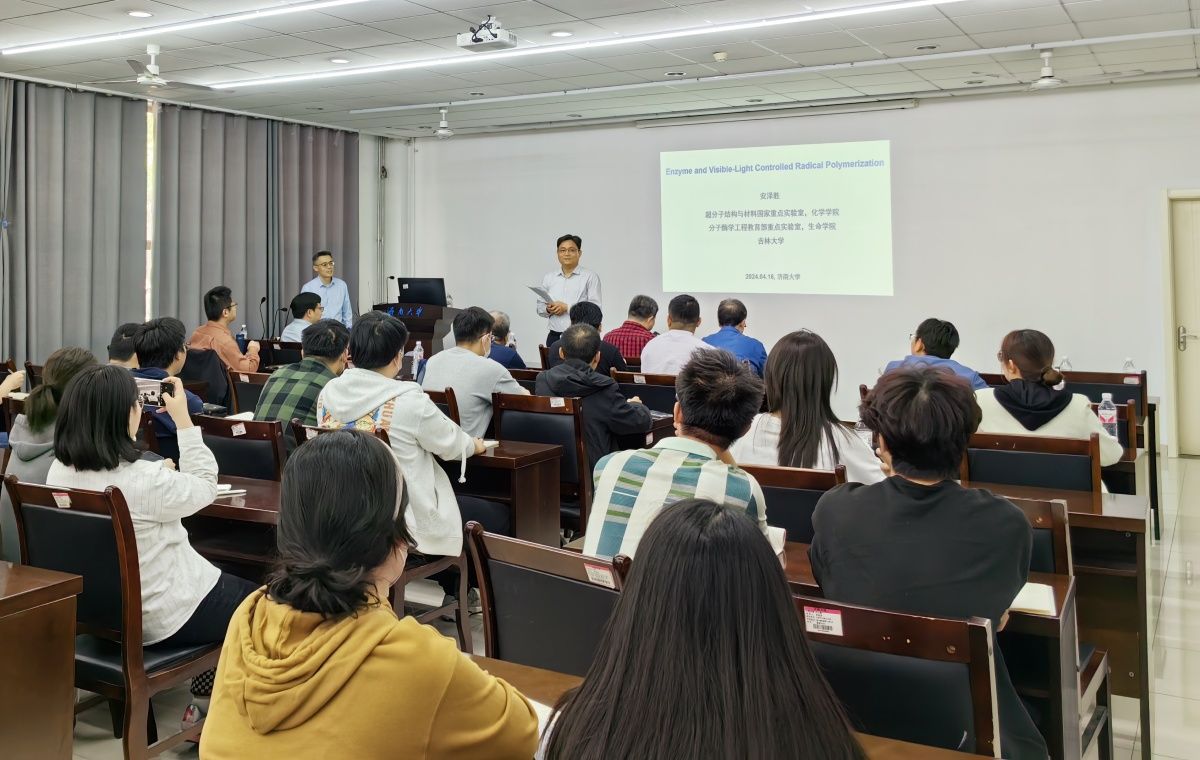 安泽胜教授以《酶和可见光控制自由基聚合》为题作学术报告,主要介绍了天然酶和可见光介导自由基聚合方面的研究进展,重点讲述了酶催化RAFT聚合研究方向,提出了光酶催化精确合成聚合物的新概念,实现了可见光调控与酶催化两种环境友好体系的有机结合,为进一步推动酶催化的多样性并将其用于可控自由基聚合开辟了新途径;建立了聚合诱导自组装调控聚合物胶体微粒形貌的方法,揭示了胶体微粒的形貌转化机理,实现了在高固体含量下对聚合物分子量、构型与组装体形貌的有效控制。
