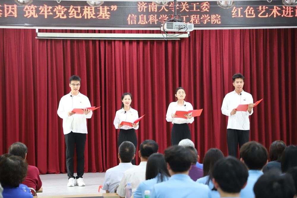 活动开始前,学校关心下一代工作委员会秘书长、离退休工作处处长高卫红和信息科学与工程学院党委书记夏卫东分别致辞,介绍了活动背景、活动目的和意义。活动在经典红色朗诵《孔繁森之歌》中拉开帷幕,朗诵者声情并茂的讲述了“青山处处埋忠骨,一腔热血洒高原”孔繁森的感人事迹。随后,济南市朗诵艺术家协会主席华青等十余位校内外老艺术家、老教师带来了《英雄本色》《我是共产党员我没有忘记》《一双布鞋和满坡的迎春花》《人生岁月》等红色经典文艺作品,讲述了以“失踪”33年的志愿军战士柴云振为代表的革命先烈的英雄事迹。sunbet申搏官方网站原工会主席张洪安创作的《sunbet申搏的秋天》深情讲述了学校建校75周年艰辛光荣的发展历程,表达了学校全体师生争创“一流”的坚定决心和信心。信息科学与工程学院廉扬等学生党员的诗朗诵《廉洁颂》则向党组织表达了新时代青年坚守初心使命、铭记修身立德的郑重承诺。信息科学与工程学院组织员李童童以一首《又唱浏阳河》将现场气氛带到高潮,现场气氛热烈,掌声阵阵。最后,文艺展演在全体党员齐声合唱《歌唱祖国》中落下帷幕。