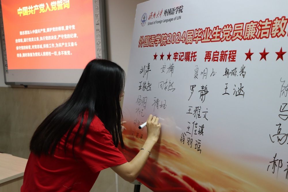 开展党纪学习教育是加强廉洁文化建设的基础和保障。加强毕业生对《中国共产党纪律处分条例》的解读学习、理解运用,组织毕业生重温入党誓词,是激励毕业生党员坚守初心使命,誓守廉洁之风,增强纪律意识,提高党性修养的重要举措。商学院组织毕业生党员开展《中国共产党纪律处分条例》解读学习;文化和旅游学院邀请省委党校专家为毕业生党员代表讲解《中国共产党纪律处分条例》;生物科学与技术学院推送《青年干部违纪违法典型案例》;政法学院开展“明纪强党性 践廉润初心”主题党日活动;外国语学院开展“党规党纪印我心 廉洁清风伴我行”党纪学习教育主题党日活动并观看警示教育片;数学科学学院开展毕业生廉洁教育签名活动;全体毕业生重温入党誓词。把毕业生廉洁教育与党纪学习教育相结合是一场思想大锻炼,切实让毕业生把党纪印在心中,有效增强了毕业生的政治定力、纪律定力、道德定力、抵腐定力。
