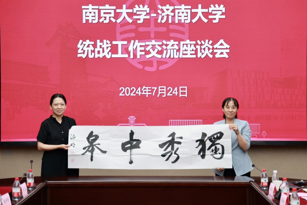 会前,大家集体参观了南京大学校史馆,了解了百廿南大的发展历程与辉煌成就。学校向南京大学赠送了我校美术学院教师成海明精心创作的书法作品。