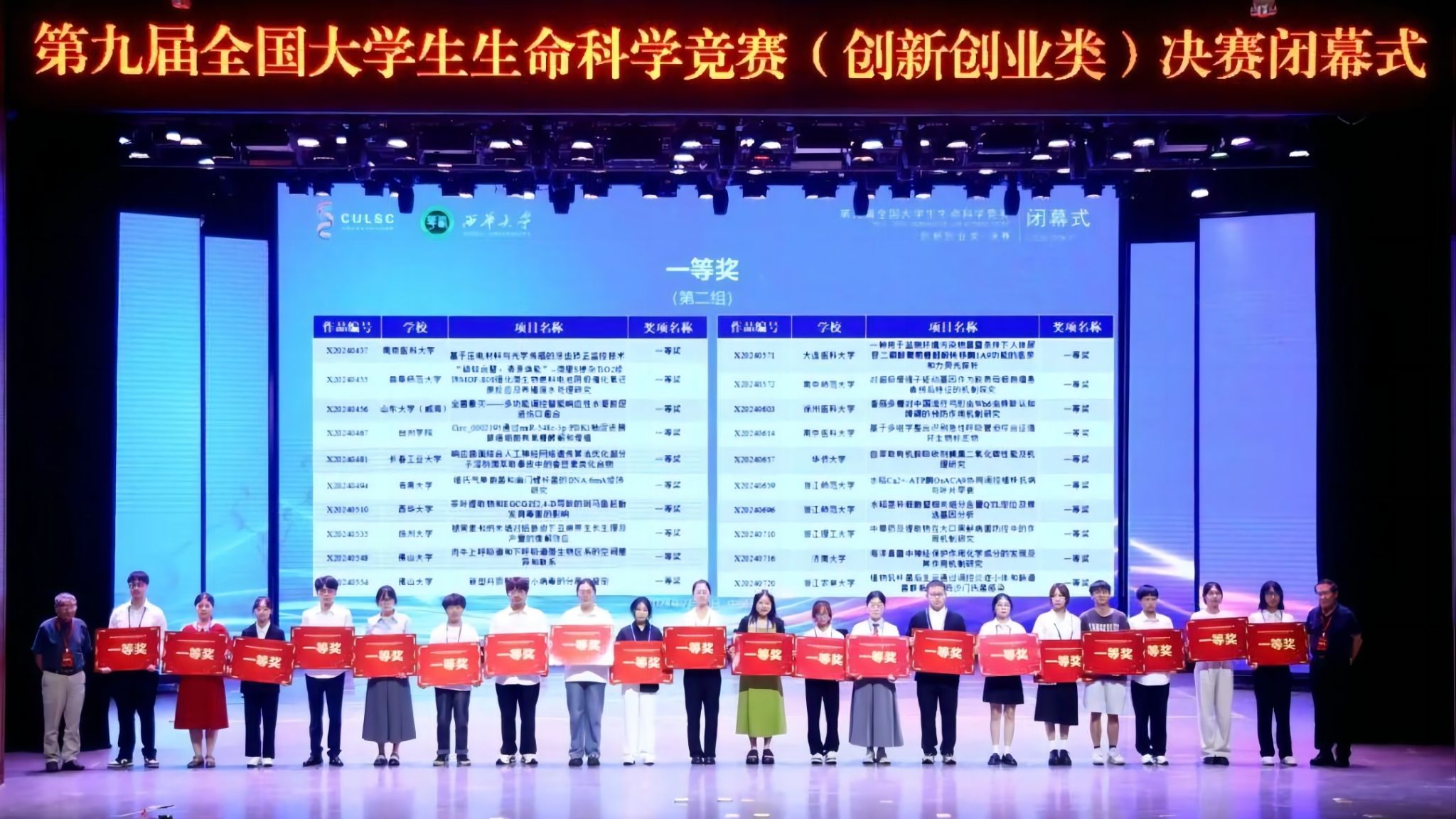 大赛设有创新创业类和科学探究类两个赛道,经竞赛组委会评议,在创新创业类赛道,由生物科学与技术学院刘心平、马若萍、李静雯、程馨慧、万怡同学完成的作品《海洋真菌中神经保护作用化学成分的发现及其作用机制研究》和由化学化工学院梁嘉欣、郭瑞琪、顾添帅、何仁杰、刘星辰、陈凯慧同学完成的作品《食安“芯”动——基于“电-磁”双场调控的纸基食品污染物快检芯片的制备及应用》获得一等奖;由生物科学与技术学院陈明昊、王雅菲、马雨欣、赵一霏、席宏键、马元欣同学完成的作品《长芝菌安——灵芝新型促生防病生态制品》和卢佩瑶、孙傲雪、李静雯、白雅琪、王君宇、程馨慧同学完成的作品《植逢盛“噬”——新型植物噬菌体农药》,由化学化工学院刘泽薇、李彦哲、乔帅超、管腾同学完成的作品《便携式微流控传感芯片在癌症标志物痕量检测中的应用》,由信息科学与工程学院刘帅、孔欣悦、于嘉怡、胡天赏、马玉贵、葛海统同学完成的作品《人类遗传数据资产库访问控制系统》,由水利与环境学院袁野、梁子稣、孔佳琪、张姝涵、董思辰、罗小权同学完成的作品《浒浒生威——科技赋能浒苔治理引领者》获得三等奖。在科学探究类赛道,由生物科学与技术学院张世栋、杨佳豪、郑贺文、杨鑫怡、刘长影同学完成的作品《玉米F3H基因家族鉴定及F3H6响应盐胁迫的功能分析》,刘雅坤、曲传辉、赵涵、邱潇、常奕萱同学完成的作品《褐藻胶裂解酶 V57 的截短体构建及其性质研究》获得二等奖;杨皓越、王榕、翟文晶、吴婷婷、高洁同学完成的作品《利用重组大肠杆菌以乙酸钠为唯一碳源合成L-丙氨酸》,赵一霏、区凯翘、王睿、刘佳谊、马浩然同学完成的作品《高效苯酚降解菌的筛选及其应用研究》,迟雅文、侯彭若、孟汇雅、丁舒心、王天阳同学完成的作品《海洋嗜盐菌中依克多因在盐碱地中的应用研究》,刘欣茹、马思琦同学完成的作品《仿刺参共生菌次级代谢产物中灿烂弧菌抗菌增效剂的发现及其作用机制探究》,赖紫欣、姬苏笑、陈润、柯美瑶、何楚瑩同学完成的作品《小球藻降解头孢曲松钠的转录组学研究》获得三等奖。