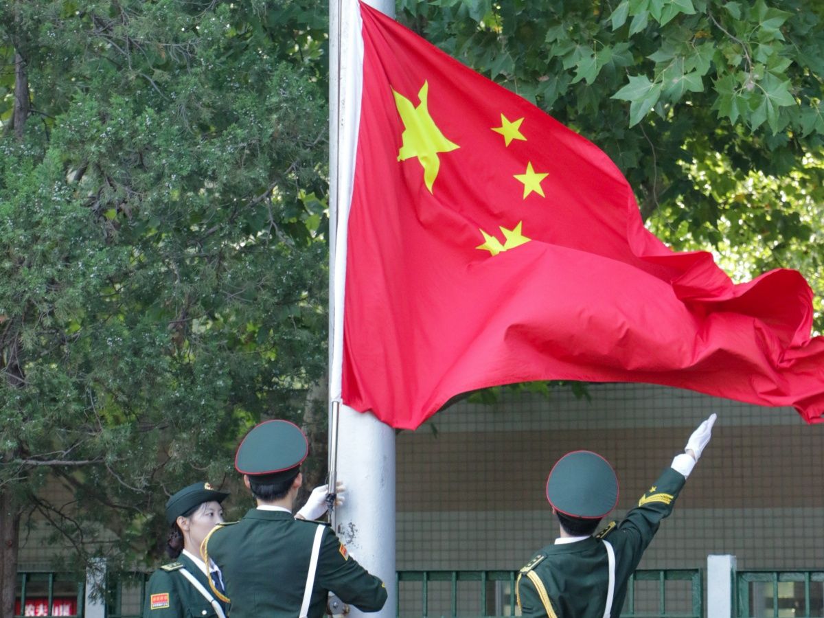 在激昂雄壮的国歌声中,鲜艳的五星红旗冉冉升起,全场师生齐唱国歌,行注目礼。
