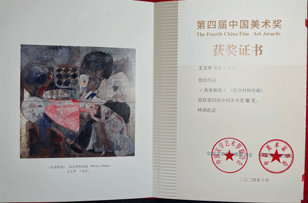 颁奖结束后,王玉华在现场接受了记者的采访。她表示,这份荣誉的获得离不开齐鲁文化厚土的滋养和中华优秀传统文化的熏陶。在创作《共享和美》时,她深受新时代的感动,祖国的繁荣昌盛和人民的幸福安宁给予了她无尽的创作灵感。同时,中华文化上千年的文明、先哲圣人们的宁静辽阔情怀都激励着她不断前行。她心怀感恩,想通过绘画体会古典的博大辽阔与安宁在当下的物化形式,并以崭新的姿态和面貌去呈现她所理解和感受到的一切。