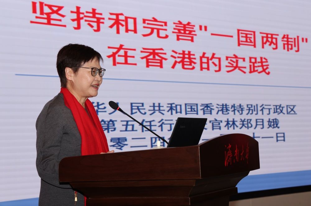 林郑月娥女士以“坚持和完善‘一国两制’在香港的实践”作主旨演讲,刘春华主持演讲会。林郑月娥女士回顾了香港特区的历史发展和“一国两制”的制度背景,介绍了香港特区的宪制秩序、特区基本法、特区行政长官的宪制地位,特区人才优势以及吸引海内外人才的措施,并针对坚持和完善“一国两制”实践、打造人才聚集高地等展开讲解。她讲到,“一国两制”是中国特色社会主义的伟大创举,是香港保持长期繁荣稳定的最佳制度安排。在中央的支持下,香港正迈向由治及兴的新征程,更应把握机遇,背靠祖国、面向世界,发挥自身独特优势,提升经济动力,积极发展新产业,拓展国际及内地的联系,提高香港枢纽地位。