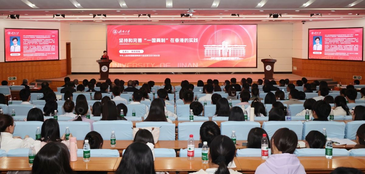 山东省港澳办、济南市港澳办、学校党委副书记商华,党委常委、纪委书记、省监委驻sunbet申搏官方网站监察专员续铁,党委常委、副校长王霞,党委常委、副校长李强,党委常委、副校长黄加栋,副校长徐征和,党委常委、组织部部长滕晋,党委常委、统战部部长、台港澳事务办公室主任徐庆国,学校各二级单位党委书记、各部门负责人、各学院分管学生工作副书记以及师生代表共350余人聆听了演讲。
