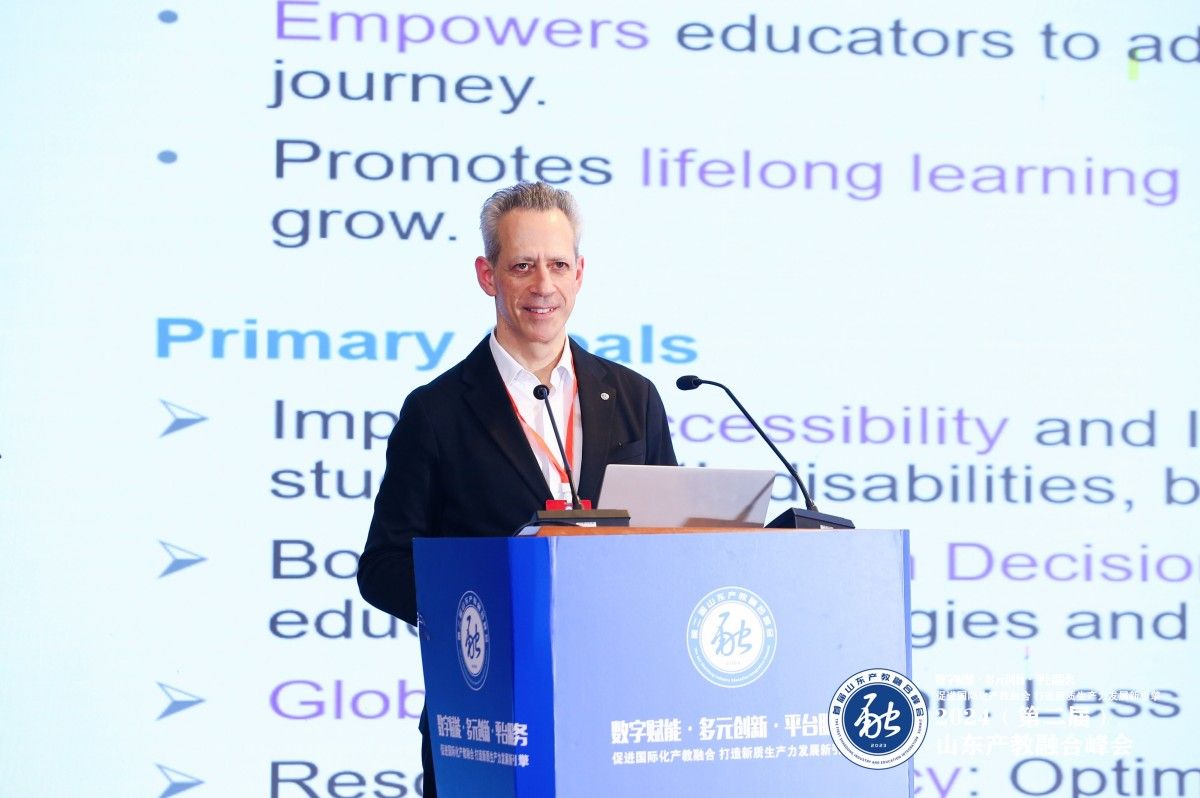 下午的专家报告,由山东省职业技术教育学会副秘书长杜德昌和山东省高等教育管理科学研究会秘书长宋新刚先后主持。深圳职业技术大学党委书记杨欣斌、青岛科技大学校长陈克正、德国XU指数应用技术大学校长菲利普·德·卡斯特罗·索埃罗教授、北京产教融合科学研究院院长李杰、济南信息工程学校原党委书记刘光泉、山东国数发展股份有限公司总经理姜健、山东智慧健康产业集团董事长李光等先后围绕产教融合与校企合作、高水平教科产融合、数字时代国际教育、数智时代育人模式创新、数智赋能产教融合、数字时代产教融合的机遇挑战以及数智化康养等进行了经验分享,为峰会提供了多维度、多角度、立体化、系统化的产教融合盛宴。