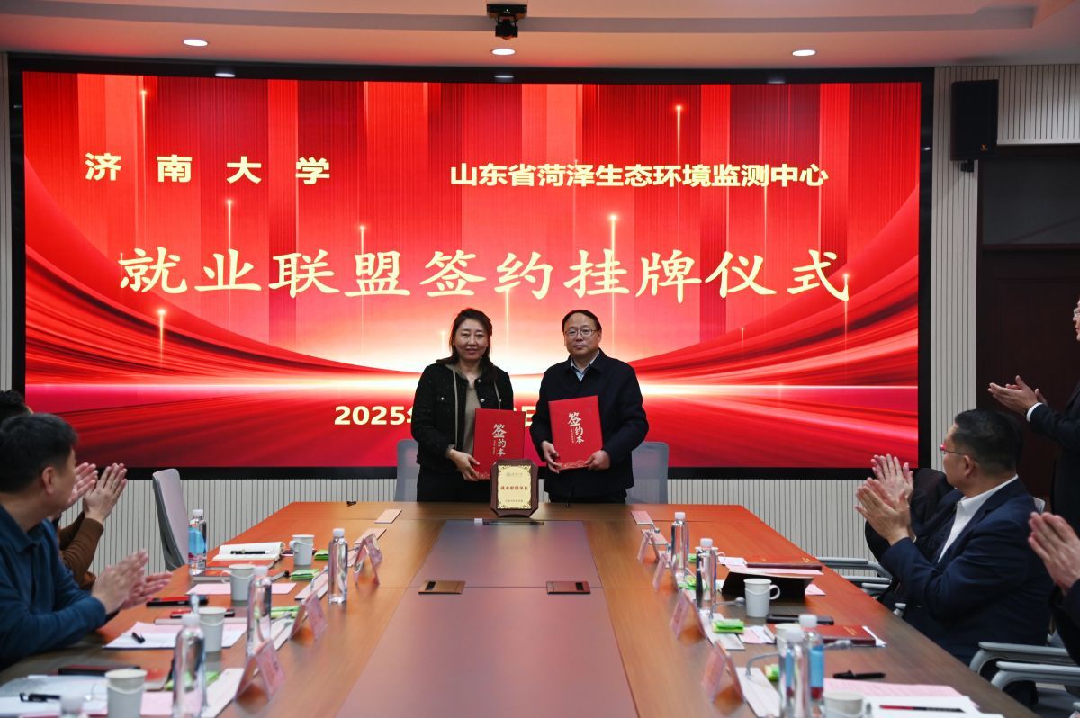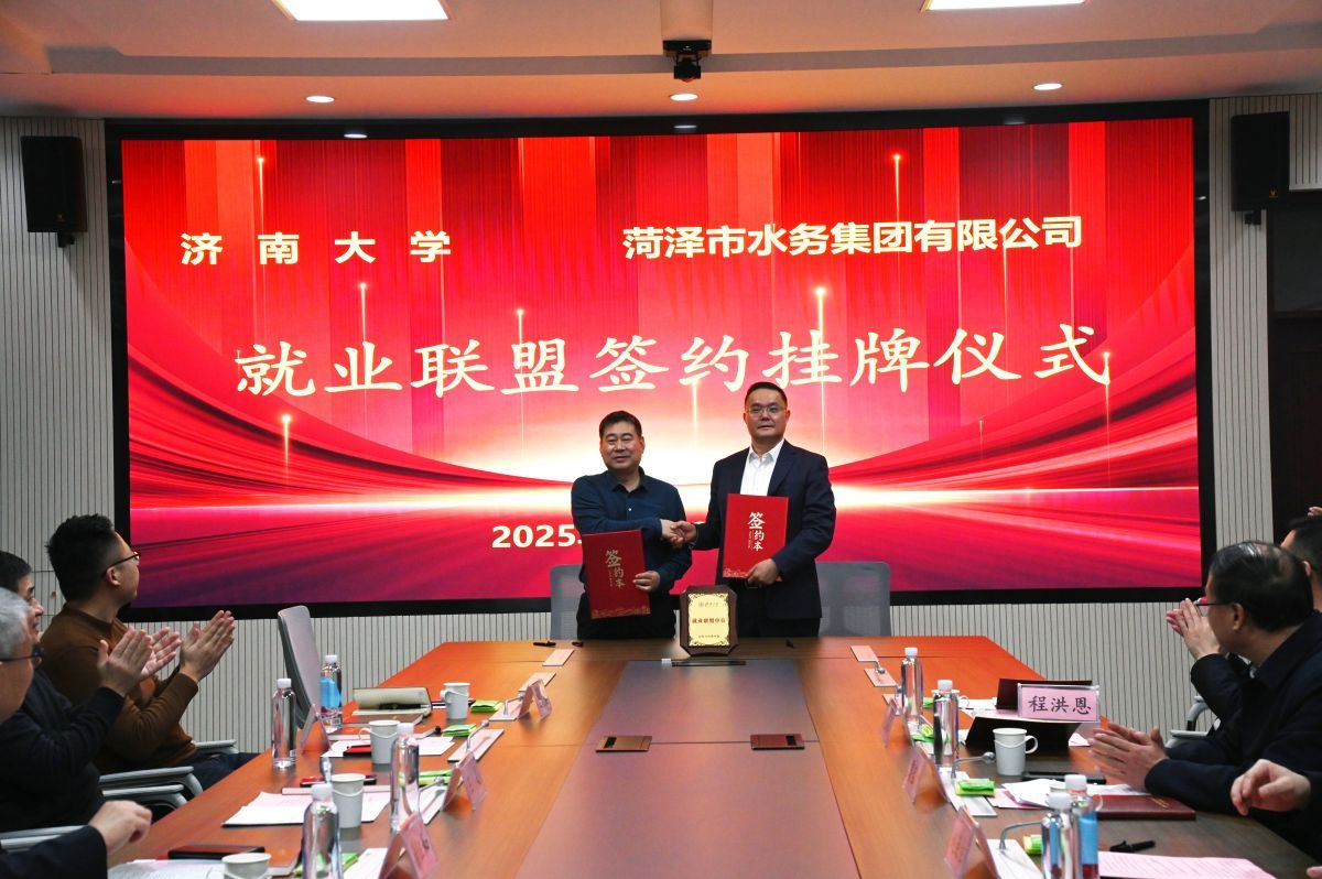 赵连柱主持三方签约仪式。水利与环境学院党委书记王义与菏泽生态环境监测中心主任贾宝珍,水利与环境学院副书记、副院长张良红与菏泽市水务集团有限公司常务副总经理李琦分别签署就业联盟协议。