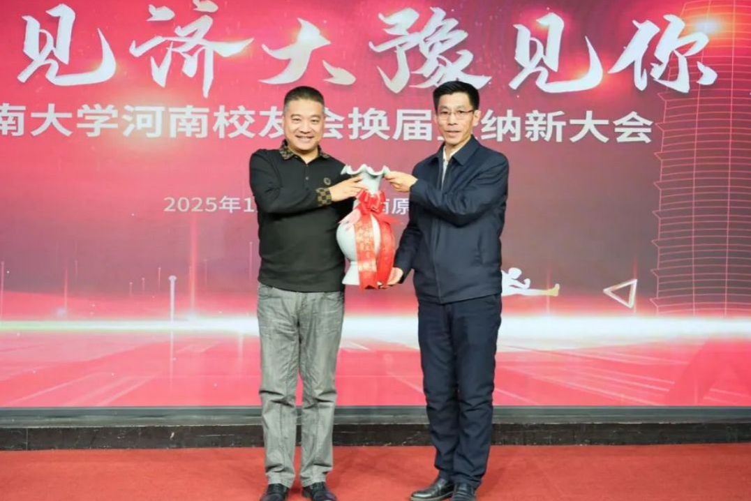 会上,李强代表学校向河南校友会赠送书法作品表示祝贺,杨德柱代表河南校友会向母校回赠汝瓷荷口瓶。
